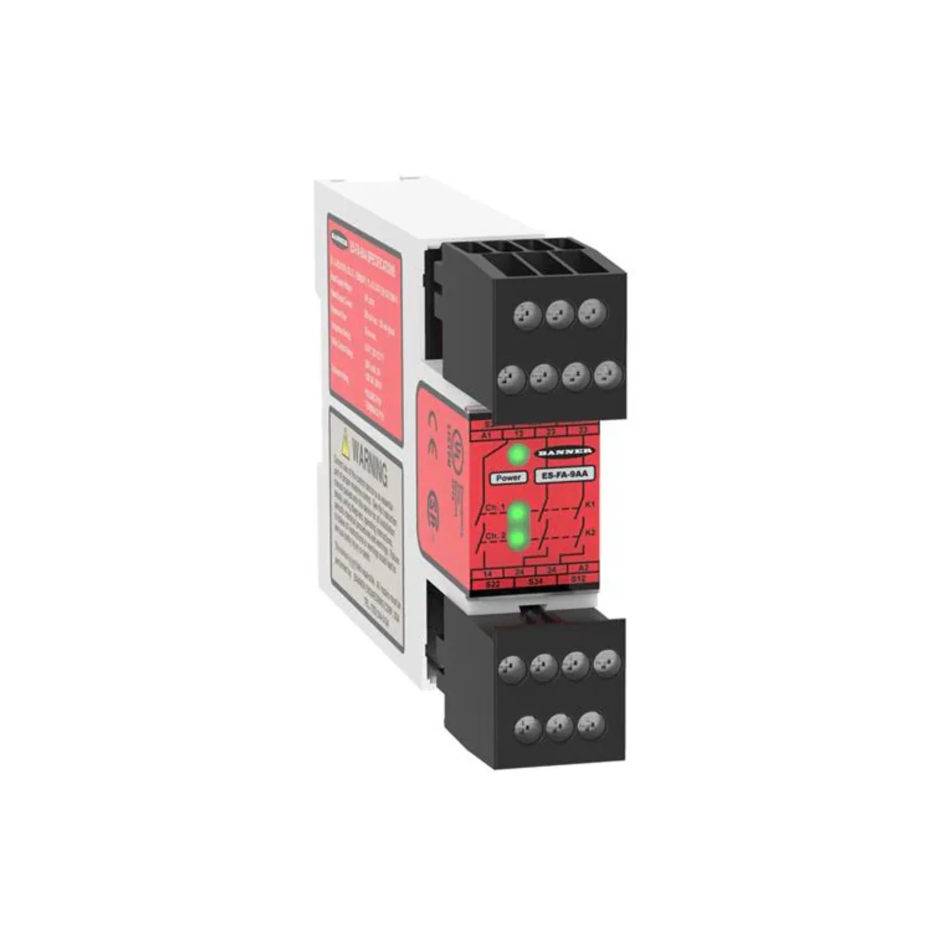 The Banner ES-FA-9AA is a safety relay module designed for dependable control and monitoring of emergency stop functions, safety gates, and light curtains. Engineered for industrial environments, it offers redundant safety outputs and assures compliance with international safety standards, making it perfect for machine safeguarding applications.